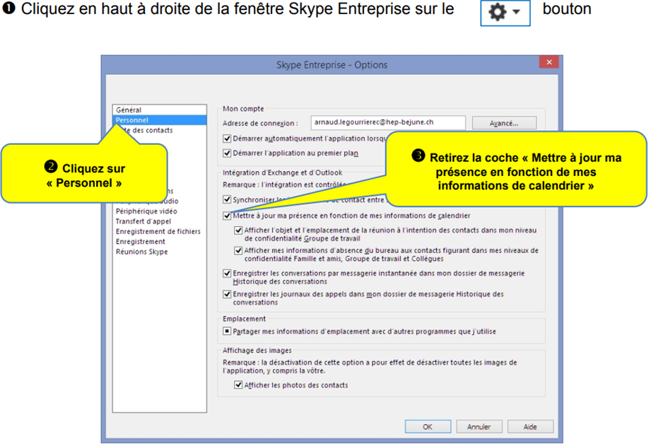Mise en place du choix de statut Skype Entreprise (indépendant d’Outlook)