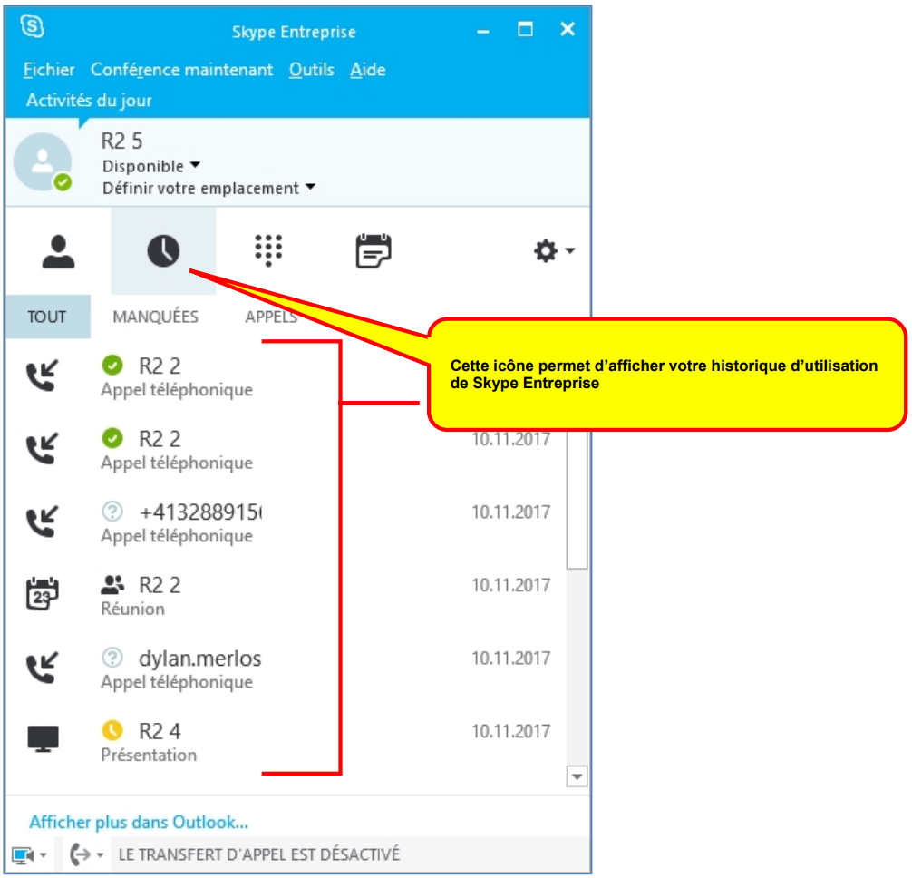 Skype Entreprise vous renseigne sur les appels reçus en votre absence (non seulement dans l’interface Skype Entreprise mais également dans Outlook) uniquement si vous bénéficiez d’une messagerie vocale.