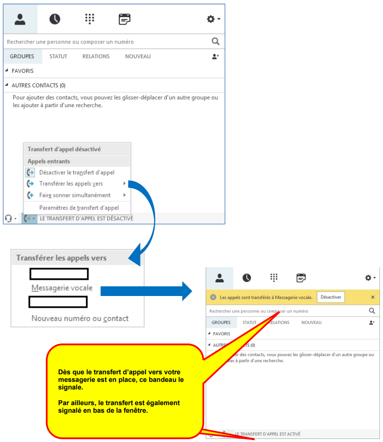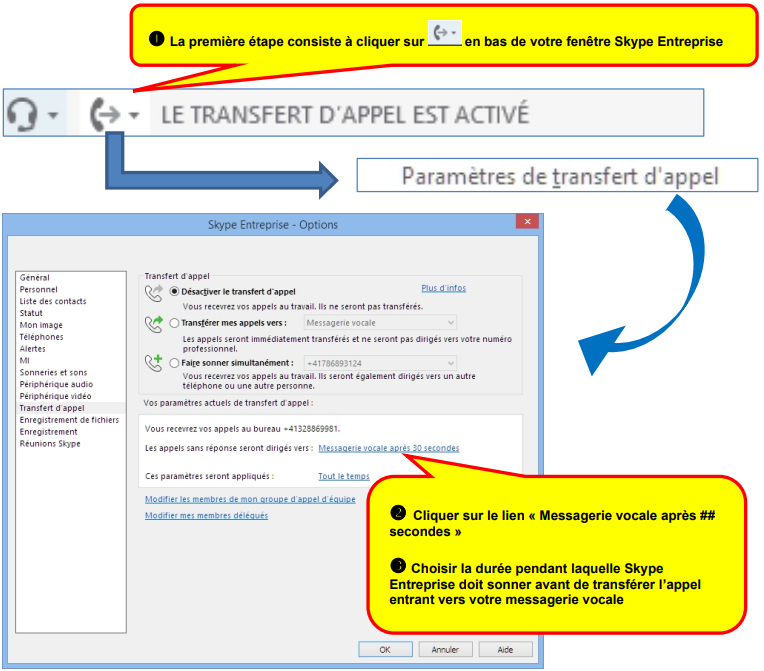 Lorsque vous mettez en place un transfert vers votre messagerie vocale, l’appel entrant ne sonnera pas dans Skype Entreprise et sera directement transféré à votre messagerie vocale.