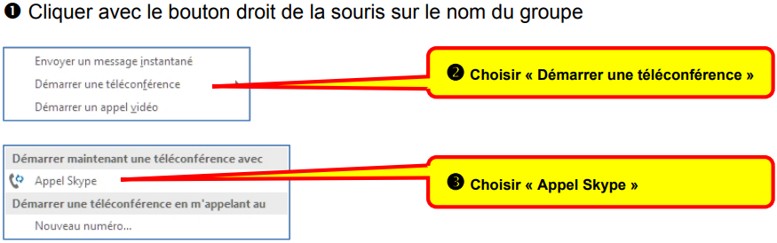 Il est possible de sélectionner des personnes dans plusieurs groupes à l’aide de la touche CTRL du clavier puis finir par cliquer avec le bouton droit de la souris sur une ce des personnes sélectionnées et choisir de démarrer une téléconférence !