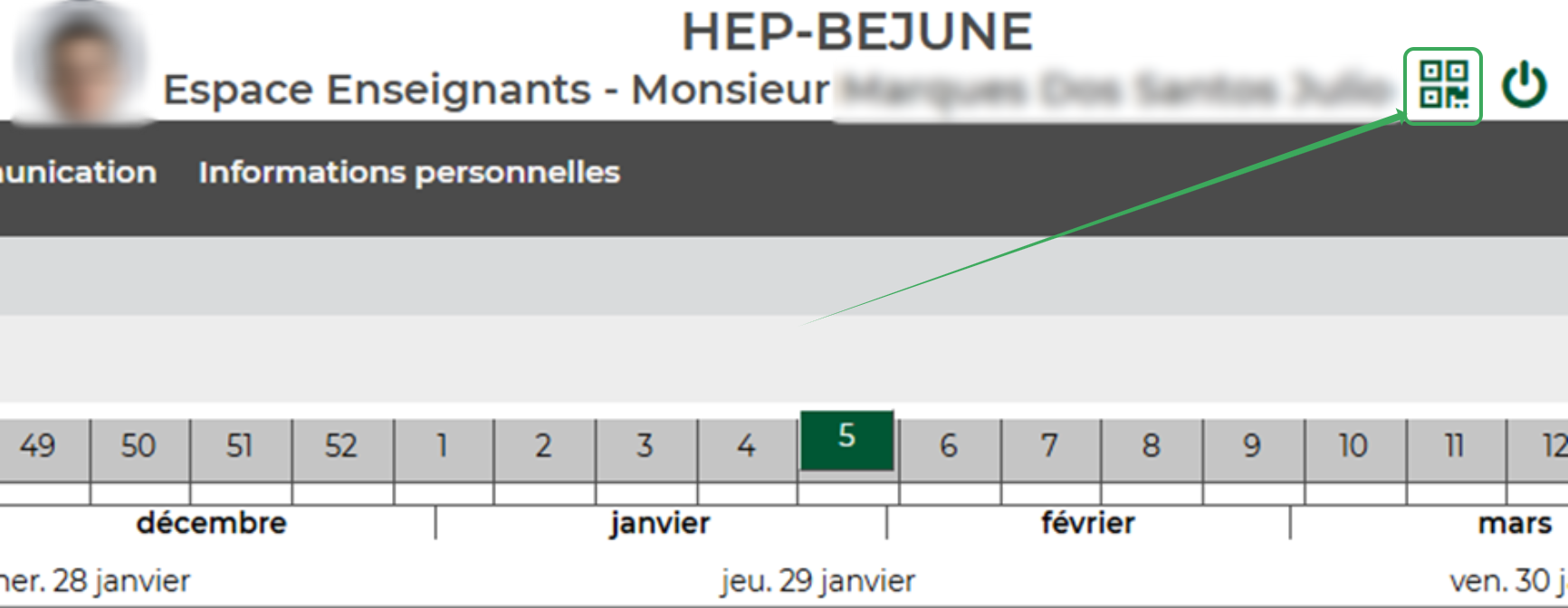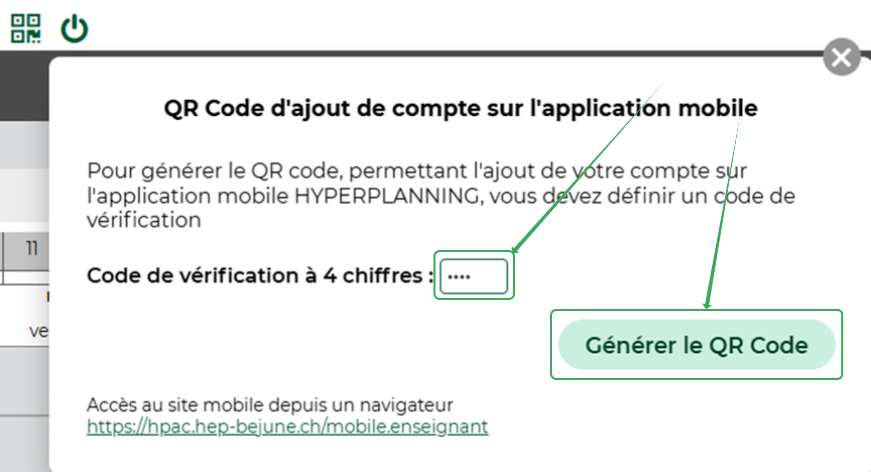 Une fois connecté, cliquez sur l'icône de QR Code en haut du site Hyperplanning, juste à droite de votre prénom