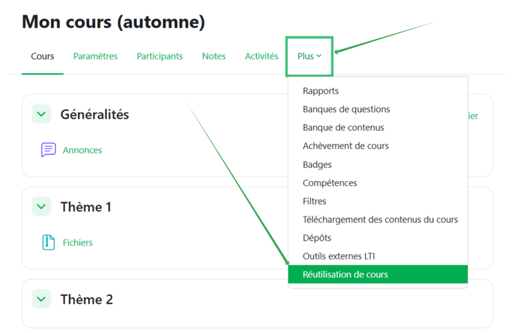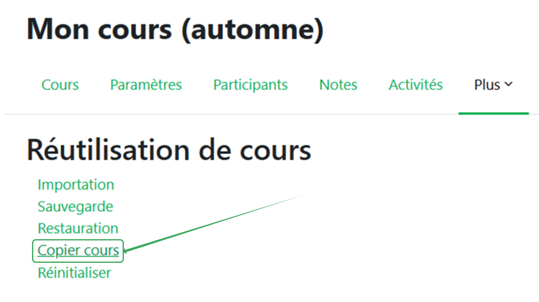 Une fois sur la page de votre cours, cliquez sur l'onglet "Plus" et une liste de choix se déroulera. Cliquez sur "Réutilisation de cours".