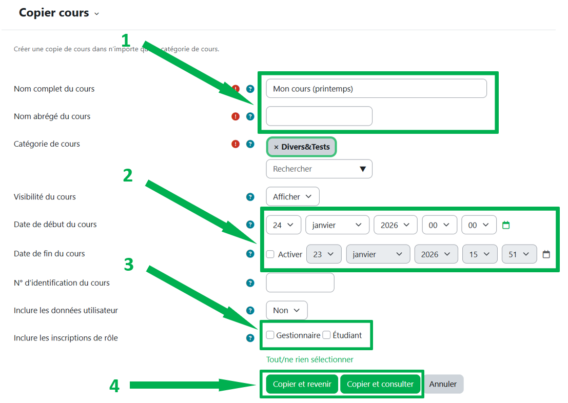 - Ces deux coches vous permettent de choisir si vous voulez ou non garder la liste de gestionnaires, enseignants ou étudiants inscrits au cours sur la copie que vous allez créer.